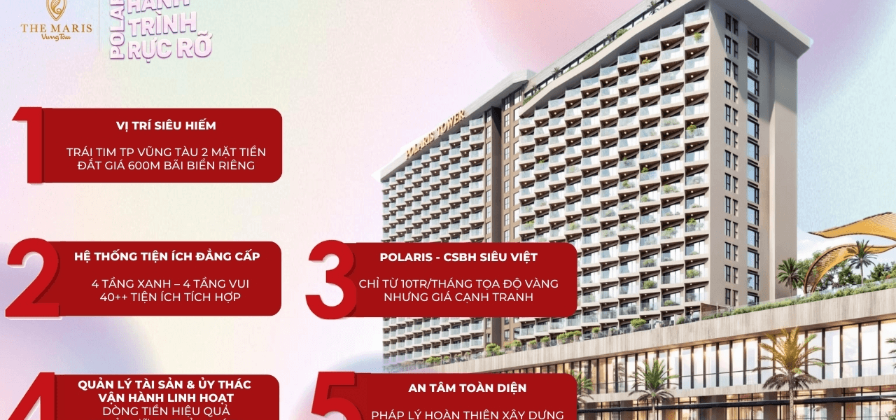 Tháp Polaric – The Maris Vũng Tàu tiên phong mô hình căn hộ startup đầu tiên tại Vũng Tàu dành cho người yêu biển. Đột phá giải pháp tài chính chưa từng có giúp người trẻ tự tin làm chủ, sở hữu kênh đầu tư linh hoạt, vừa trải nghiệm nghỉ dưỡng tối đa vừa khai thác dòng tiền tối ưu, chỉ với thu nhập ổn định hàng tháng. Với chính sách thanh toán siêu nhẹ phù hợp với người trẻ có công việc ổn định, căn hộ Polaris chính là nấc thang giúp chủ nhân tiếp cận giấc mơ tự do tài chính, thoải mái tận hưởng cuộc sống trong tương lai.