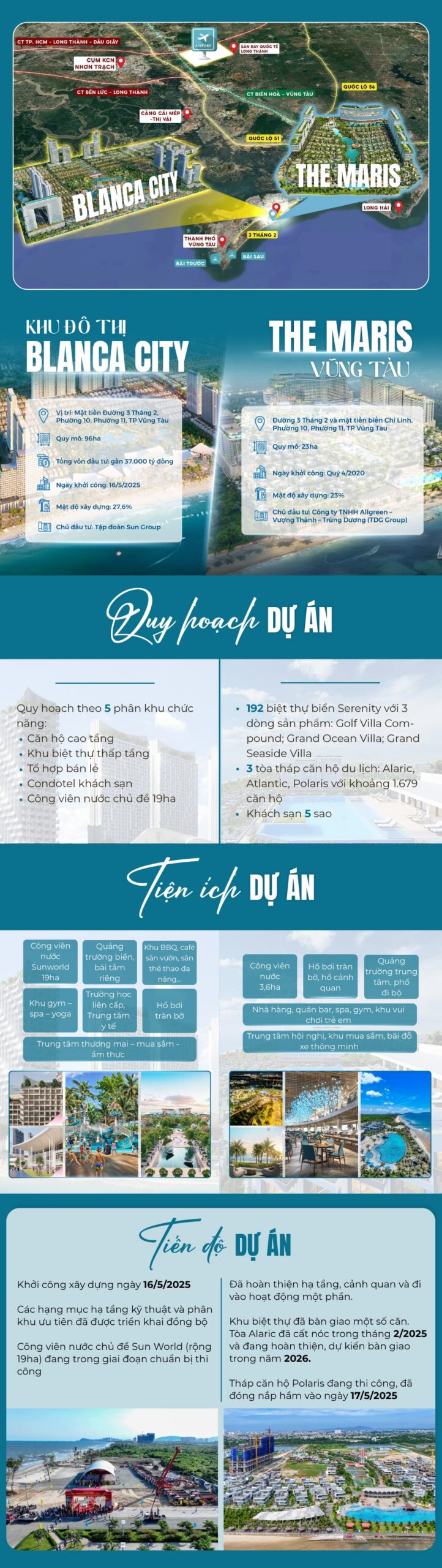 Ngay bên cạnh, tổ hợp nghỉ dưỡng The Maris Vũng Tàu cũng đang dần hoàn thiện, với một số hạng mục đã đi vào hoạt động, trở thành điểm đến thu hút khách du lịch thời gian gần đây. Cả hai dự án đều tọa lạc trên tuyến đường 3/2 – khu vực được đánh giá là trung tâm phát triển bất động sản nghỉ dưỡng mới nhờ vào vị trí ven biển, giao thông thuận lợi và tiềm năng du lịch vượt trội.