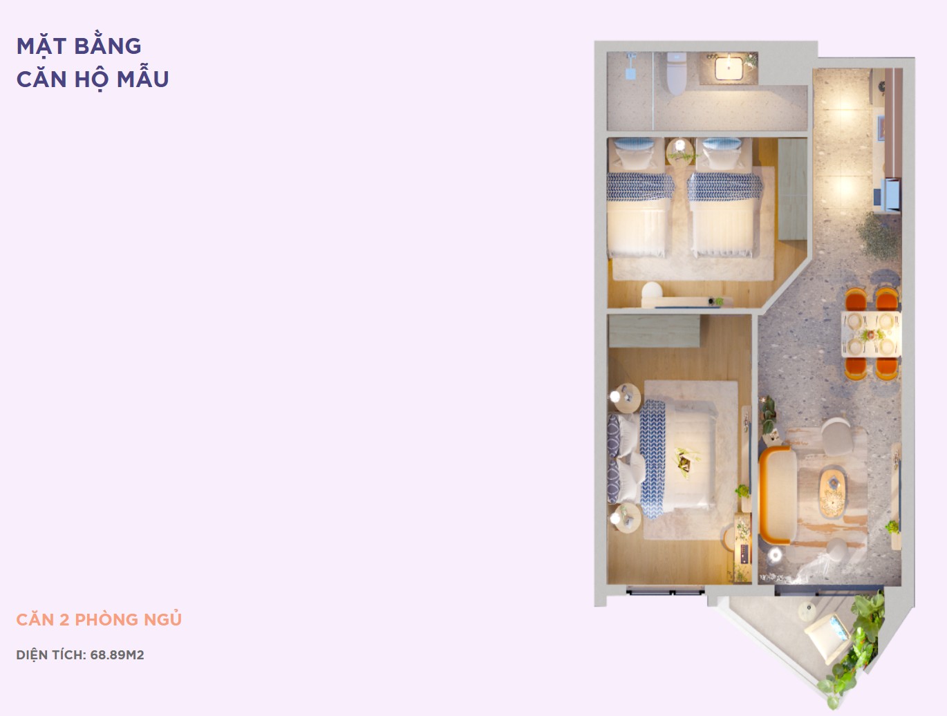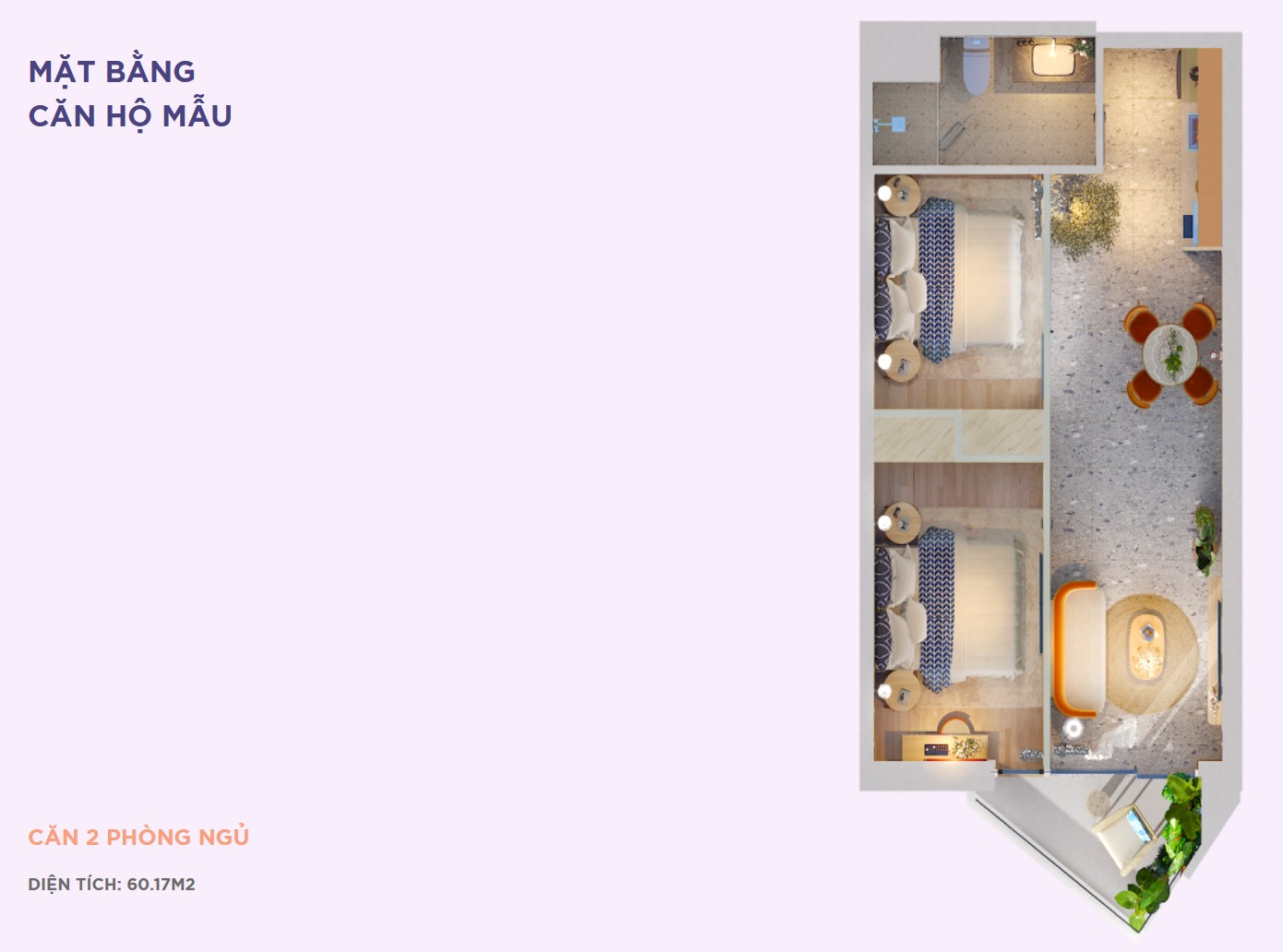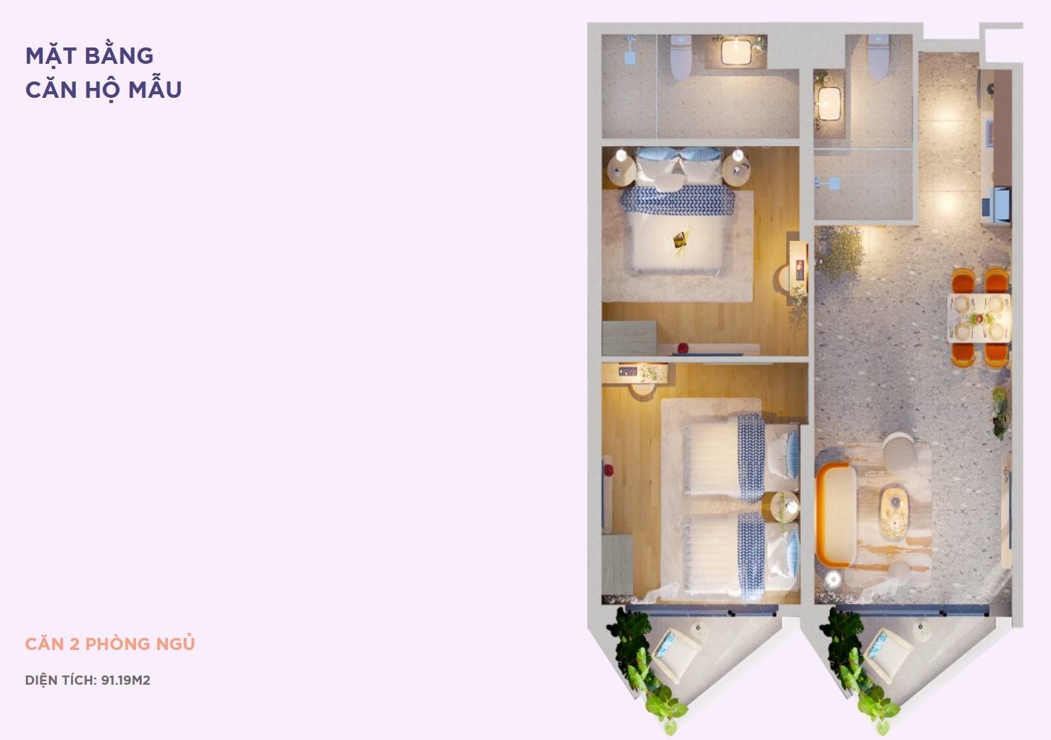 Mặt bằng căn hộ 2 phòng ngủ (60-91m2) Polaris Vũng Tàu