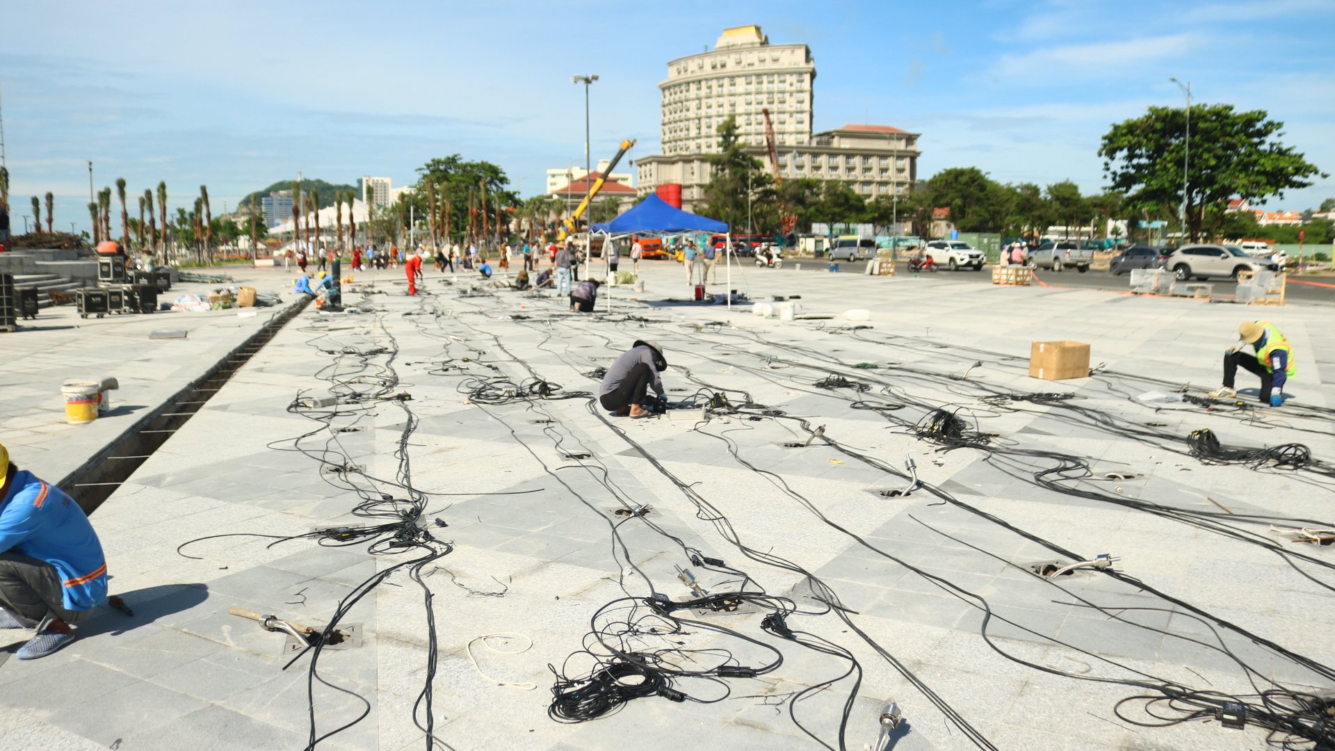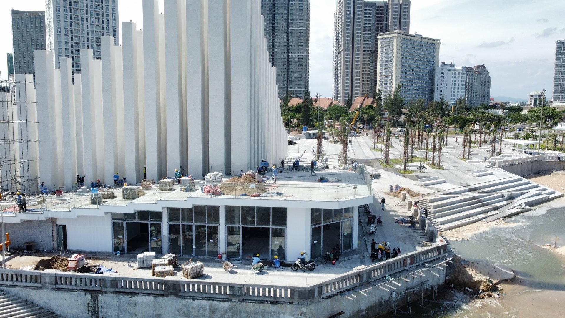 Dọc theo công viên, mặt nền được lát đá granite sang trọng, kết hợp với hệ thống ao cạn nước ngọt để du khách tiện rửa chân tay sau khi dạo chơi trên biển. Hiện tại, các đội công nhân vẫn đang khẩn trương thi công để kịp tiến độ khánh thành đúng dịp lễ Quốc khánh 2/9.