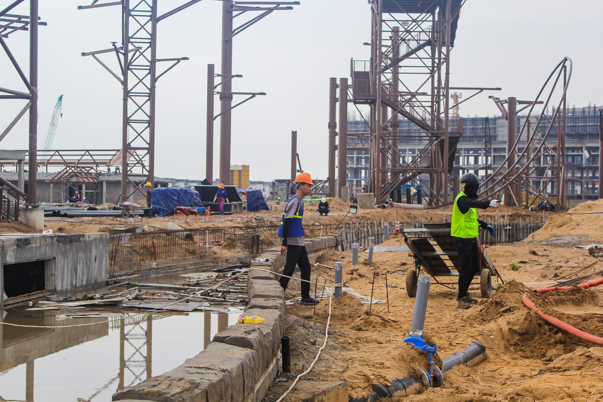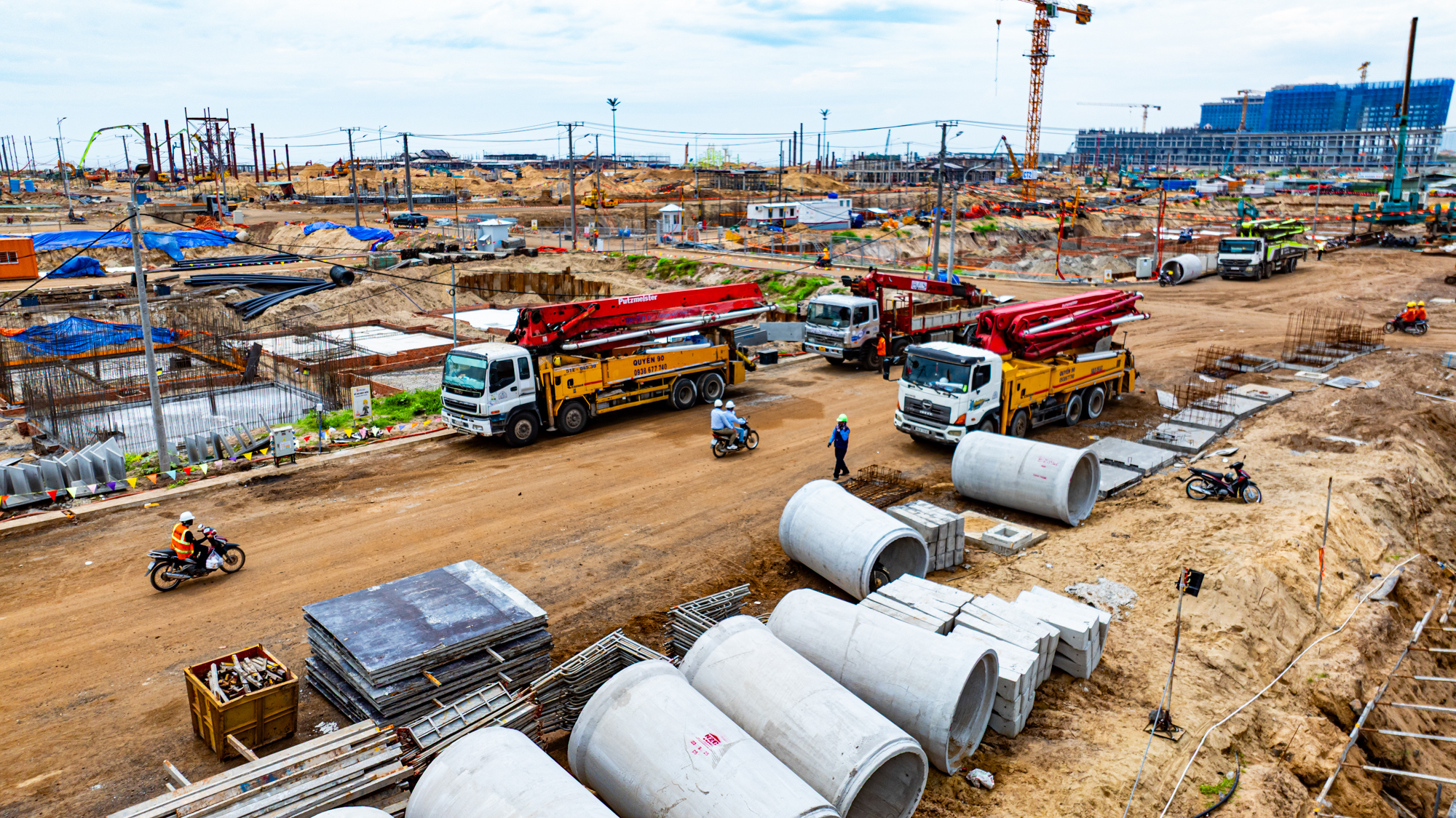 Ghi nhận thực tế tại công trường cho thấy hoạt động thi công diễn ra liên tục. Xe vận tải, máy ép cọc, xe bơm bê tông hoạt động với tần suất cao; nhiều tuyến đường nội khu đã hoàn thành lớp hạ tầng kỹ thuật đầu tiên.