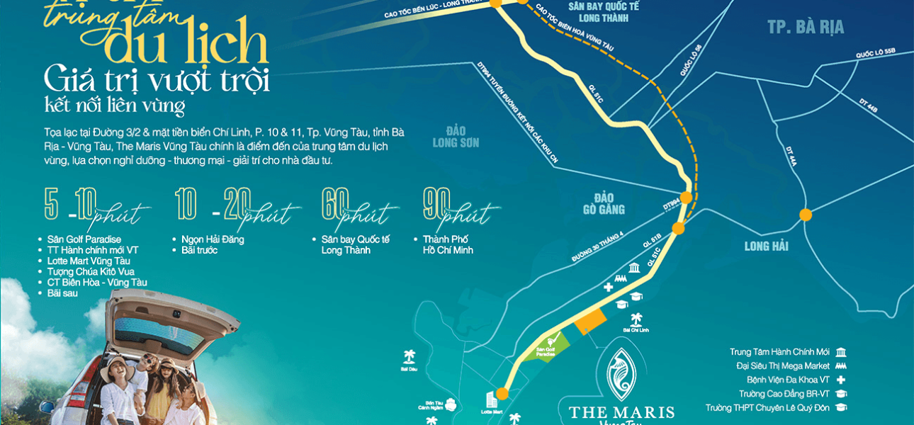 Từ sân bay Quốc tế Long Thành, thay vì phải tốn chặng đường tương đối dài để di chuyển đến các khu nghỉ dưỡng biển tại Hồ Tràm, Phan Thiết, . . . quý du khách chỉ cần tốn thêm khoảng 1 giờ 30 phút di chuyển đến nghỉ dưỡng tại The Maris Vũng Tàu, tận hưởng bầu không khí biển trong lành, yên tĩnh cùng với các tiện ích chuẩn 5 sao.