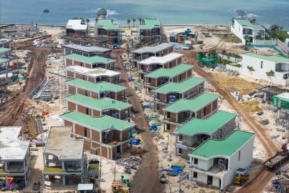 Tại khu vực gần biển, nhiều căn biệt thự song lập và đơn lập đã cơ bản hoàn thiện phần khung, mái và đang được thi công mặt ngoài. Một số căn đã bước vào giai đoạn lắp đặt hệ thống kỹ thuật, cửa và từng bước hoàn thiện nội thất bên trong.